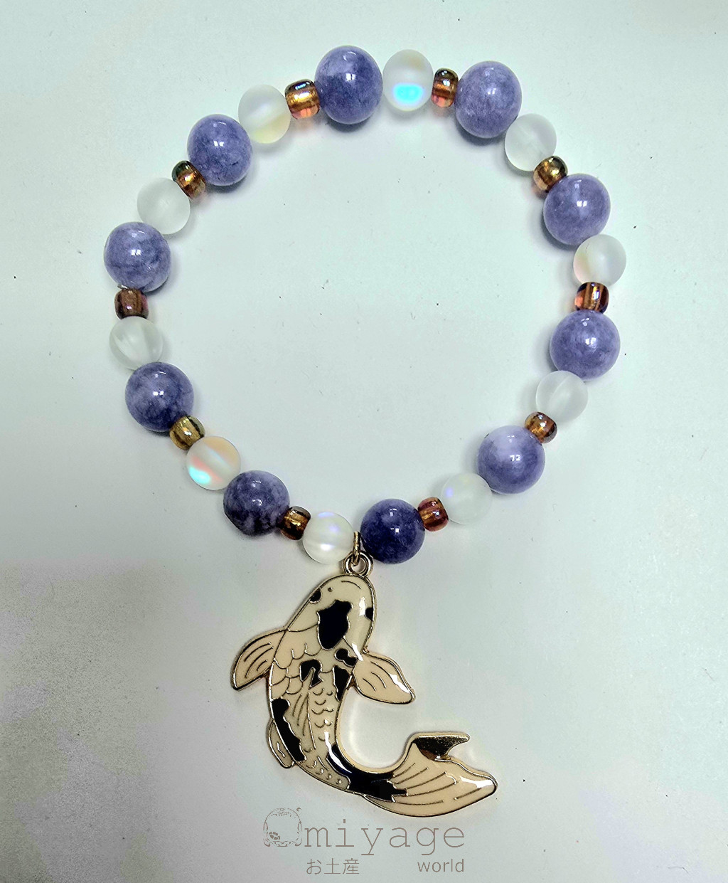 Ez a gyönyörű karkötő eredeti ásványgyöngyök és finom japán Miyuki gyöngyök kombinációjából készült, amelyek harmóniát és eleganciát sugároznak. A részletekben gazdag designhoz egy mutatós függő dísz ad különleges hangsúlyt.