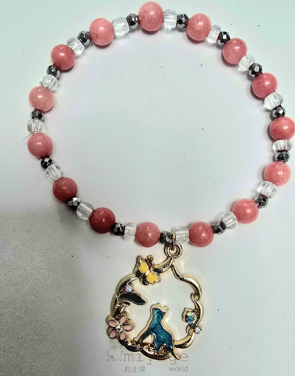 Ez a gyönyörű karkötő eredeti ásványgyöngyök és finom japán Miyuki gyöngyök kombinációjából készült, amelyek harmóniát és eleganciát sugároznak. A részletekben gazdag designhoz egy mutatós függő dísz ad különleges hangsúlyt.